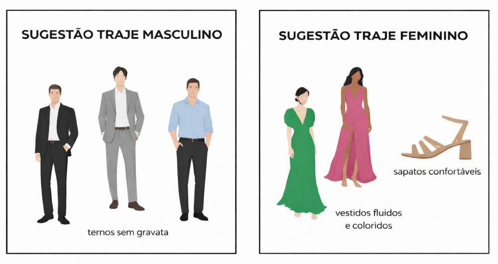 Para as mulheres, vestidos longos e fluidos, em cores alegres. Como a cerimônia será no gramado, recomendamos o uso de sapatos confortáveis para evitar qualquer imprevisto.