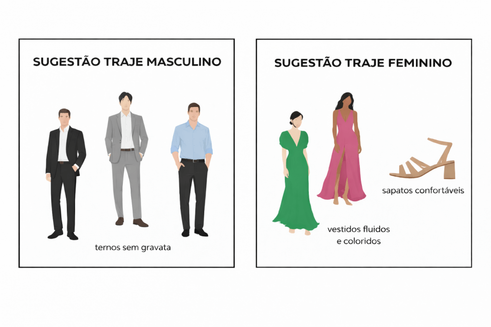 Nosso casamento será realizado ao ar livre, no período da tarde. Assim, sugerimos traje social completo.